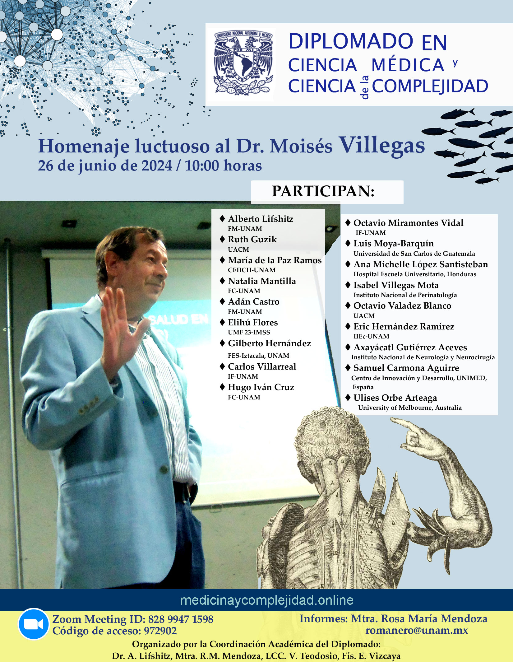 Como una forma de reconocer su labor incansable, tanto en la gestación y diseño estructural, como en la puesta en marcha y promoción de las labores del Diplomado en Ciencia Médica y Ciencia de la Complejidad (DCMyCC), y a un año de su deceso, consideramos ineludible realizarle un homenaje colectivo, que tuvo lugar el 26 junio de 2024, en modalidad virtual.
